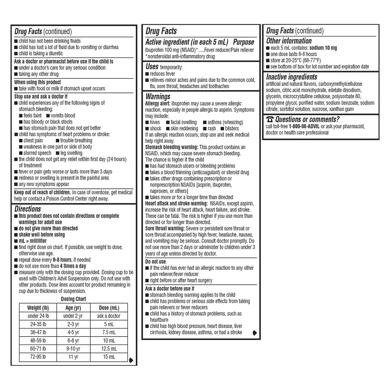 This medication may cause severe allergic reactions, especially in children allergic to aspirin, including hives, facial swelling, rash, blisters, wheezing, or shock. It contains an NSAID, which may increase the risk of stomach bleeding, heart attack, or stroke, particularly in children with stomach problems, heart conditions, high blood pressure, kidney or liver disease, or when taken with other NSAIDs, blood thinners, or steroids. Use with caution in children under 3 years old, those who are dehydrated, or taking other medications, and always follow dosing instructions carefully. Take with food or milk if stomach upset occurs, and stop use immediately if symptoms such as chest pain, trouble breathing, fainting, vomiting blood, black or bloody stools, or worsening fever/pain occur. Keep out of reach of children and seek medical help immediately in case of overdose or severe reactions.