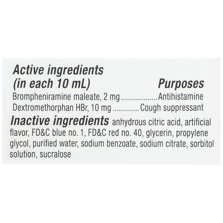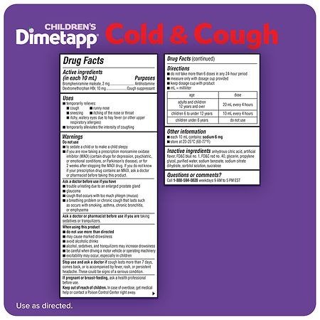 Children’s Dimetapp Cold & Cough Liquid is a fast-acting, multi-symptom cold and cough medicine formulated to relieve cough, runny nose, sneezing, and itchy, watery eyes in children ages 6 and older. This phenylephrine-free, alcohol-free formula contains brompheniramine maleate (an antihistamine) and dextromethorphan (a cough suppressant) to deliver safe and effective relief from stubborn cold symptoms. Great tasting grape flavor makes it easy for kids to take without fuss, while the trusted formula recommended by American pharmacists helps children feel better faster. Made in the USA, this 4 fl oz liquid provides dependable symptom control when used as directed.