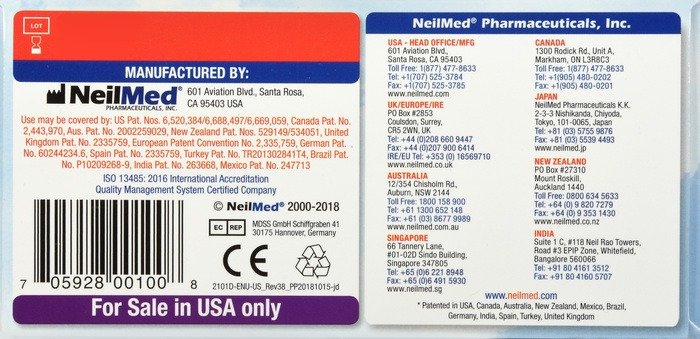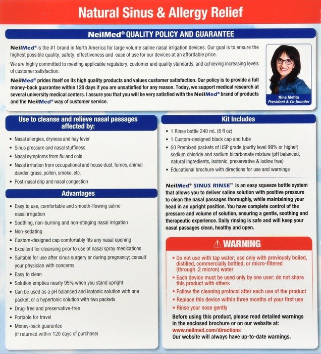 NeilMed Sinus Rinse helps alleviate sinus symptoms including post nasal drip, congestion, dryness, nasal allergies, and common cold discomfort while relieving irritation caused by dust, fumes, smoke, smog, pollen, grass, animal dander, and house dust. For safe and effective use, always rinse with NeilMed premixed packets containing USP grade sodium chloride and sodium bicarbonate, and use only distilled, micro-filtered (0.2 micron), commercially bottled, or previously boiled and cooled water at lukewarm or body temperature never plain tap water unless boiled. Clean the bottle, cap, and tube thoroughly after each use with soap and water, disinfect periodically in the microwave as directed, allow all parts to dry completely before storage, and replace the bottle every three months to maintain hygiene and performance.